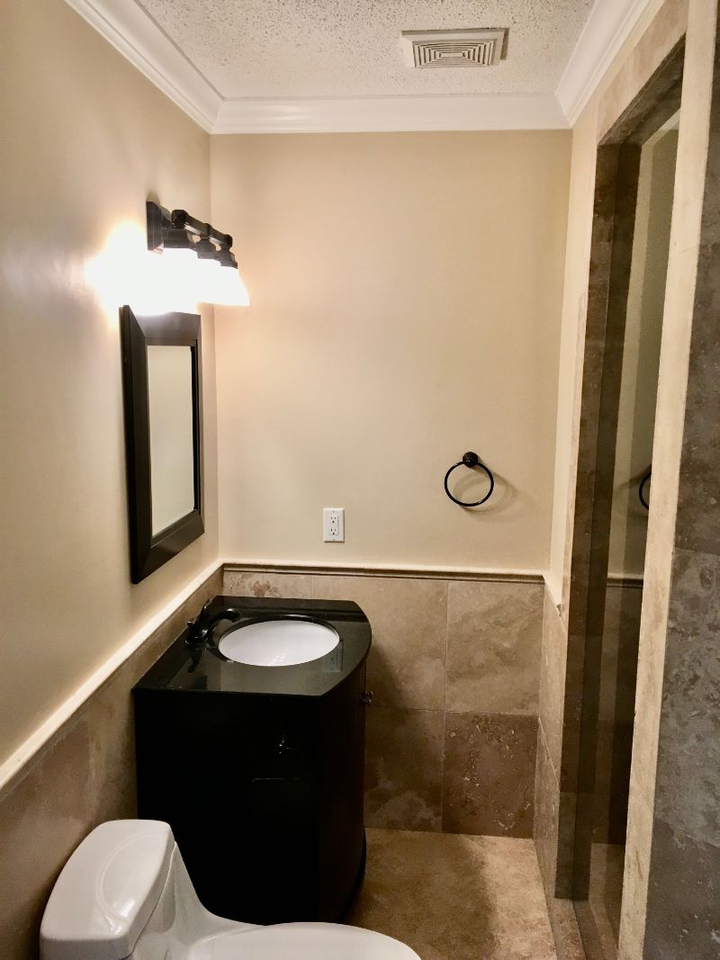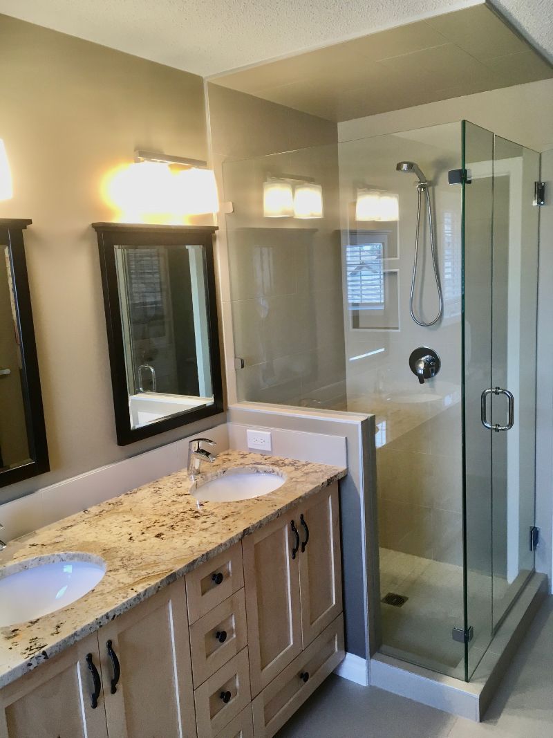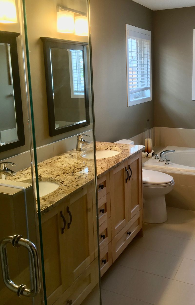 A clean, modern ensuite renovation focused on maximizing light and function. This space features a full-height tiled tub surround, a custom wood vanity with granite countertop, and updated fixtures throughout. Neutral finishes and large mirrors keep the room feeling bright and open while delivering a practical, low-maintenance layout for everyday use.