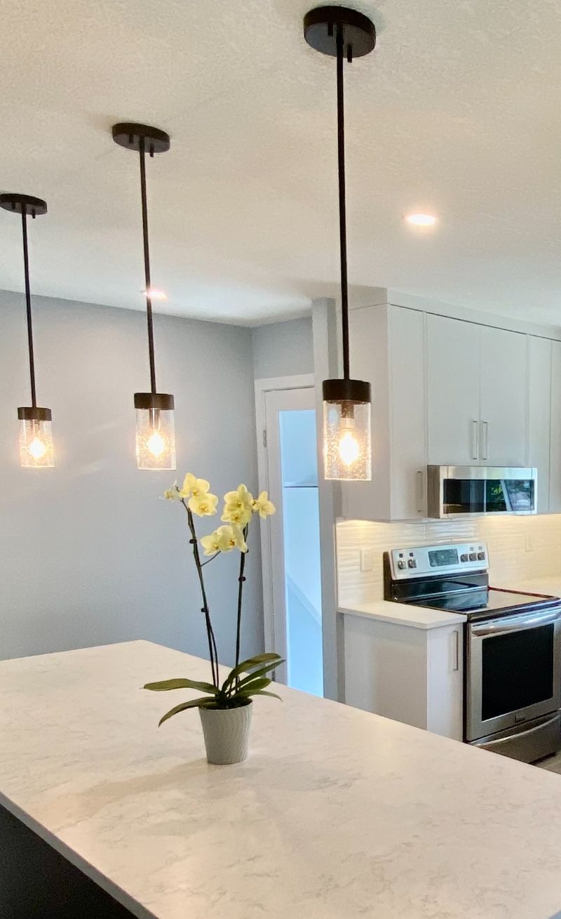 A clean, modern kitchen renovation featuring flat-panel cabinetry, quartz countertops, and a large waterfall island designed for both everyday use and entertaining. Warm pendant lighting and integrated appliances keep the space functional while maintaining a calm, minimalist aesthetic.