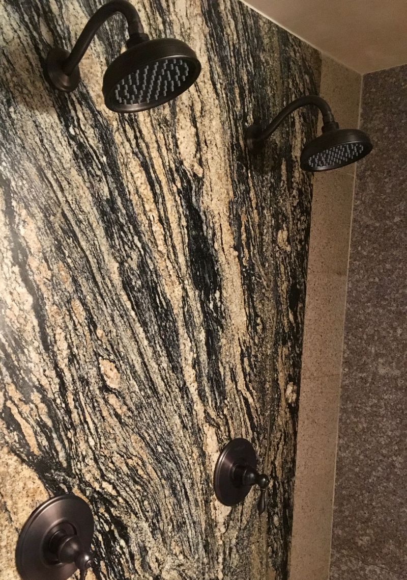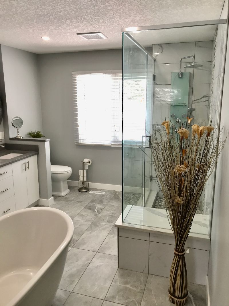 A spa-inspired ensuite featuring floor-to-ceiling marble-look tile, a frameless glass walk-in shower, and a pebble-stone accent strip for added texture and contrast. Clean lines, bright natural light, and modern fixtures keep the space feeling open, calm, and high-end.